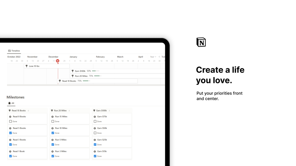 With the Notion Goal Tracker, you can easily create goals, break it down into smaller milestones, track your progress and stay on top of your tasks and commitments. Whether you're looking to get fit, learn a new skill, or just be more productive, this is the best way to make sure it gets done.