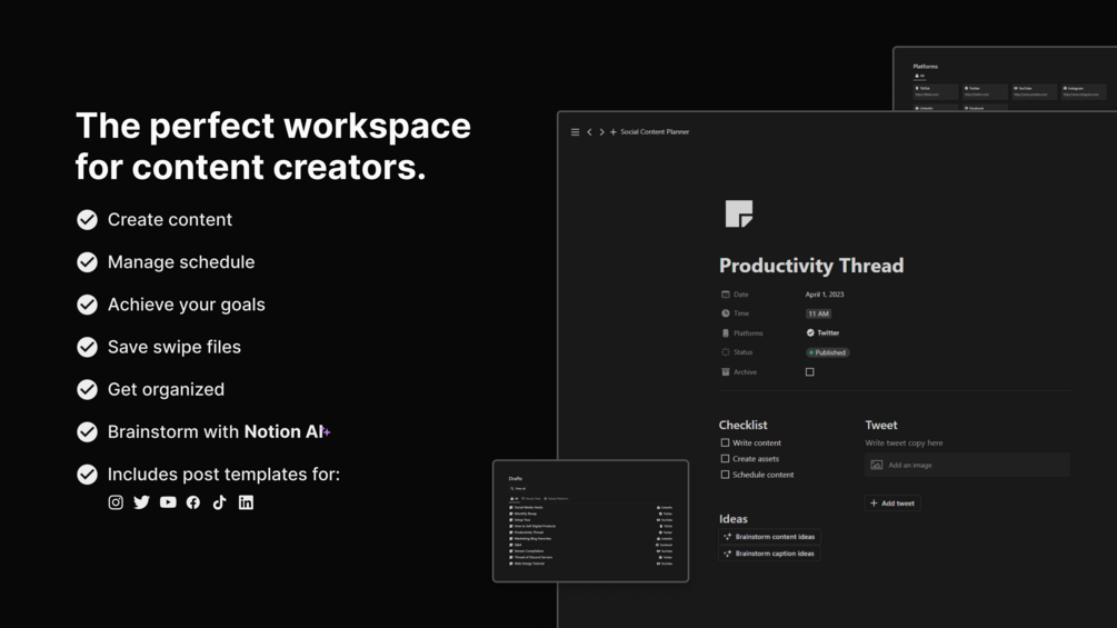 The Notion Social Content Planner is a versatile an easy-to-use dashboard designed to help you create and manage your social media content. With this Notion template, you can easily create content, manage your posting schedule, organize your content, set and track goals, and save swipe files for inspiration.