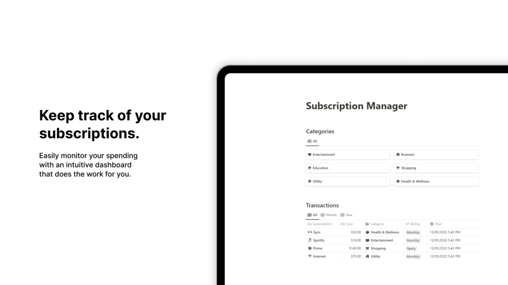 This free templates uses the new "repeating database templates" feature from Notion to take the work out of monitoring your subscription expenses.